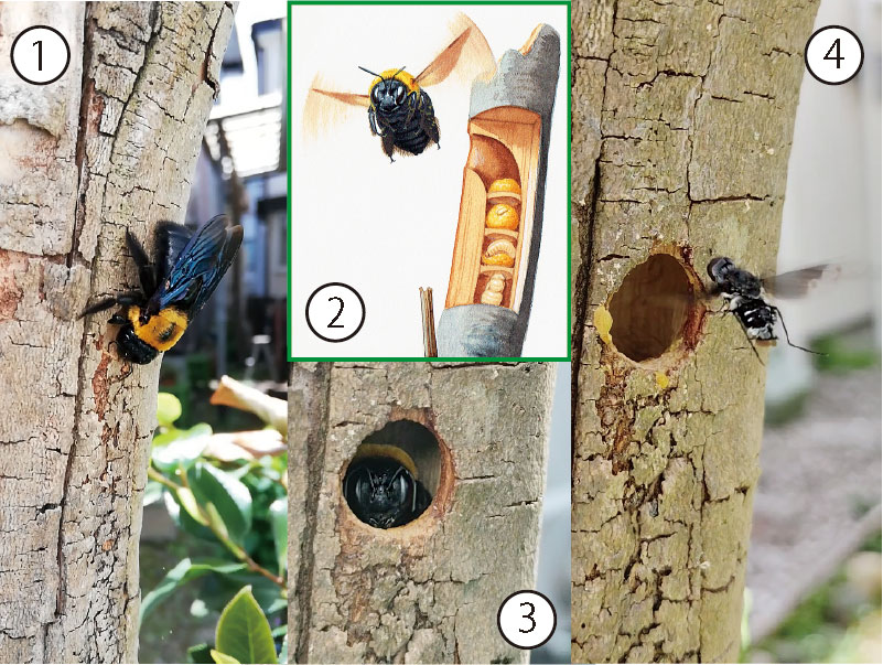 ① 今年の5月初旬、メスのクマバチが門前の枯れツバキの幹にとりつき、円形の穴を掘り始めました。パキッ パチッと大あごで削られたかんなくずが紙吹雪よろしく散ってゆきます。そうか! “carpenter bees(大工蜂)”って言うんだっけ。(東京都西東京市宅、以下同)