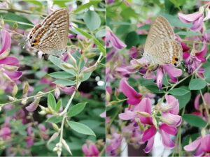 でも、今年剪定せず咲き乱れた花葉に紛れて、ウラナミシジミたちもせっせと産卵して回っていました。綺麗な着物を召して。