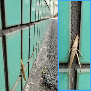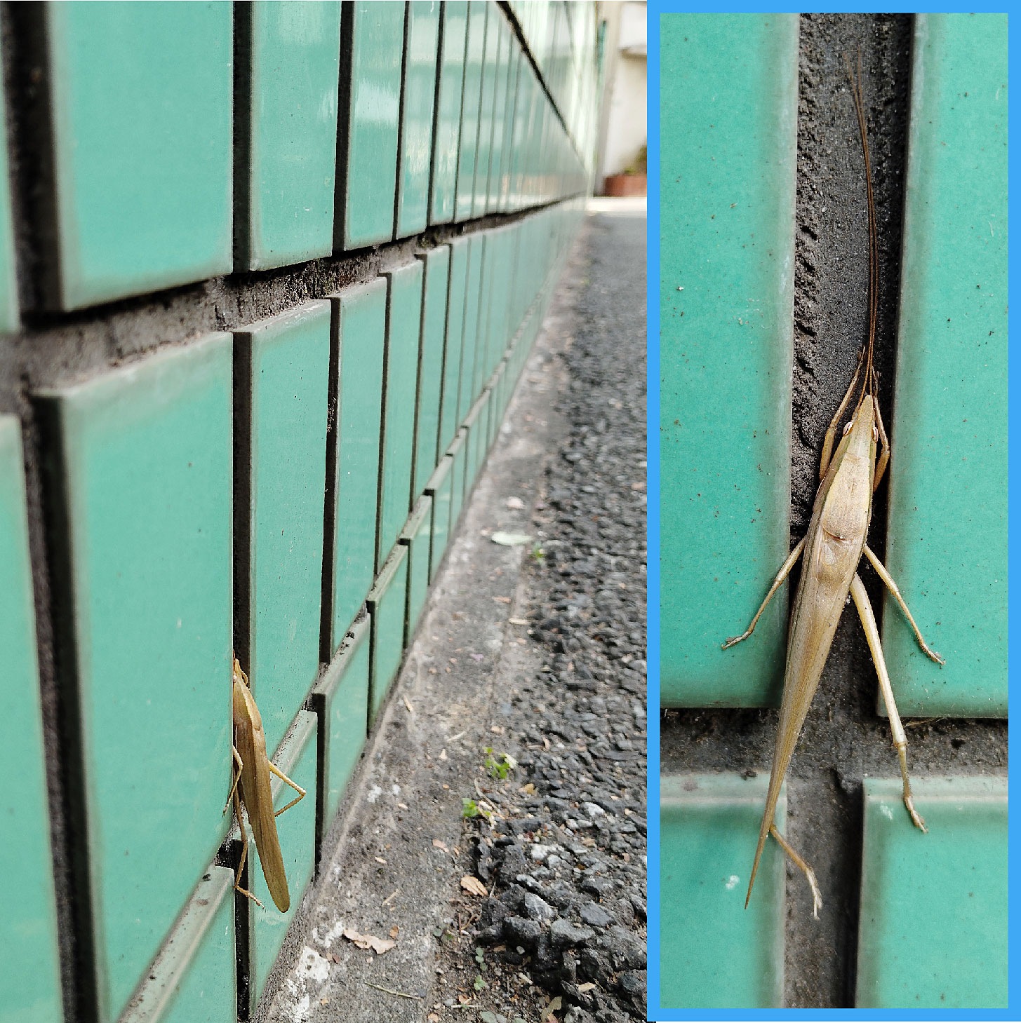 咬む力が強く、首がちぎれたって離さない。路地に建つ集合住宅の塀に枯葉色の異物あり。タイルの目地にいたのを、私が接触してしまったのか、脚の置き場がちょっと乱れています(写真)。二日後に再訪すると後脚が行儀よく溝に収まっていました。指で5-6回、強く押したらモソーと動きました。ここは昼近くには日が差し込みます。お尻の交尾器は羽に隠れて見えないけれど、背中に発音鏡が認められるのでオスですね。冬を越して来春には“ジーン”と大きく電気的な音が鳴り響くことでしょう。ちなみに体色には緑色型と褐色型とがあって、ときに赤色個体が現れるが、褐色型のメスは、赤色個体よりも珍しいのだそうです。そこで暇つぶしに標本箱を調べてみると、1体だけ褐色メスがありました。27年前の4月朝、雨宿りに来たメスでした。(12月上旬 東京都練馬区)